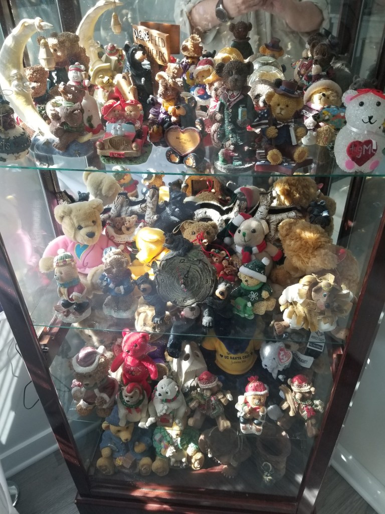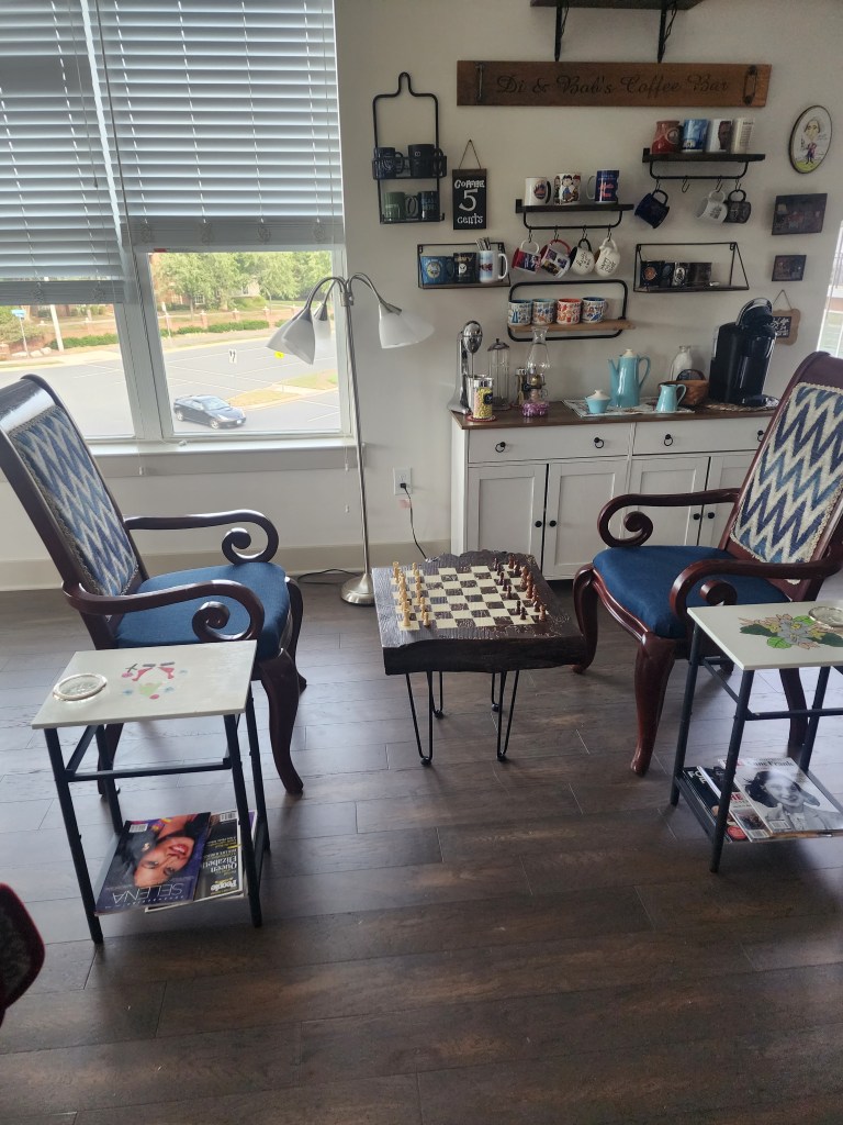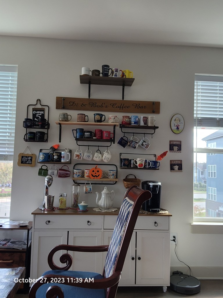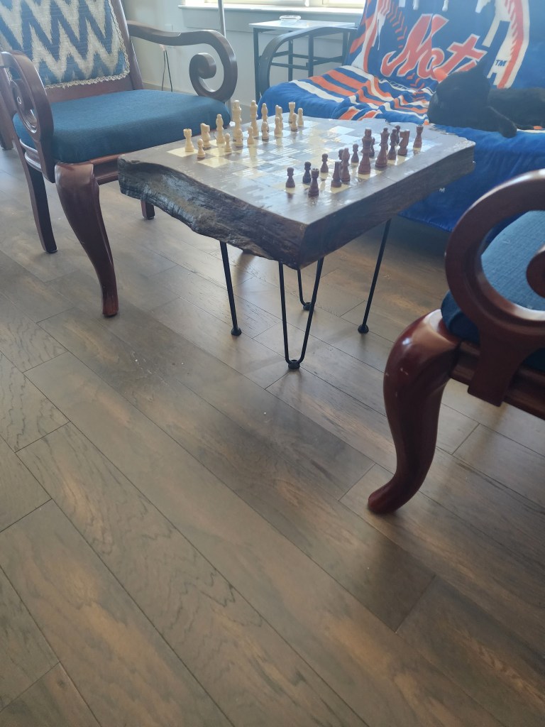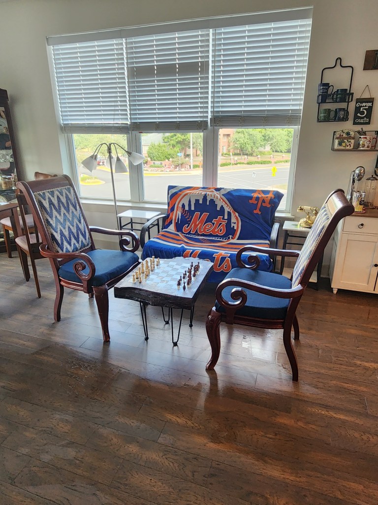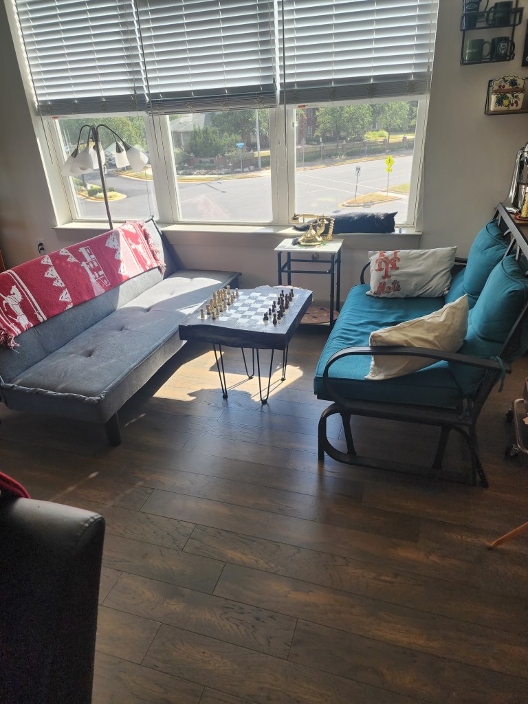 So comfy chair in our apartment complex The beginning of our balcony tables. Recreation room. Our puzzle floor. It lasted 2 months. You still have to check the disks out. Our rec room has a couple of good toys. Diane looooves balconies. Time to teach Diane chess. Our coffee bar. Part of our Mets corner. We refurbished an old table and chairs. The roof lounge of our building. 3 of Diane’s paintings. Diane found a grandfather clock at an Estate sale. She has always wanted one. Part of my bear collection. Bobby has them now. Diane made our coffee table. One of our Mets walls. Our wall. My old bear collection.